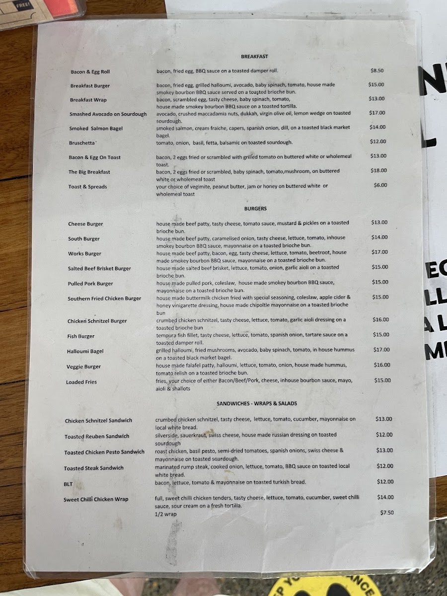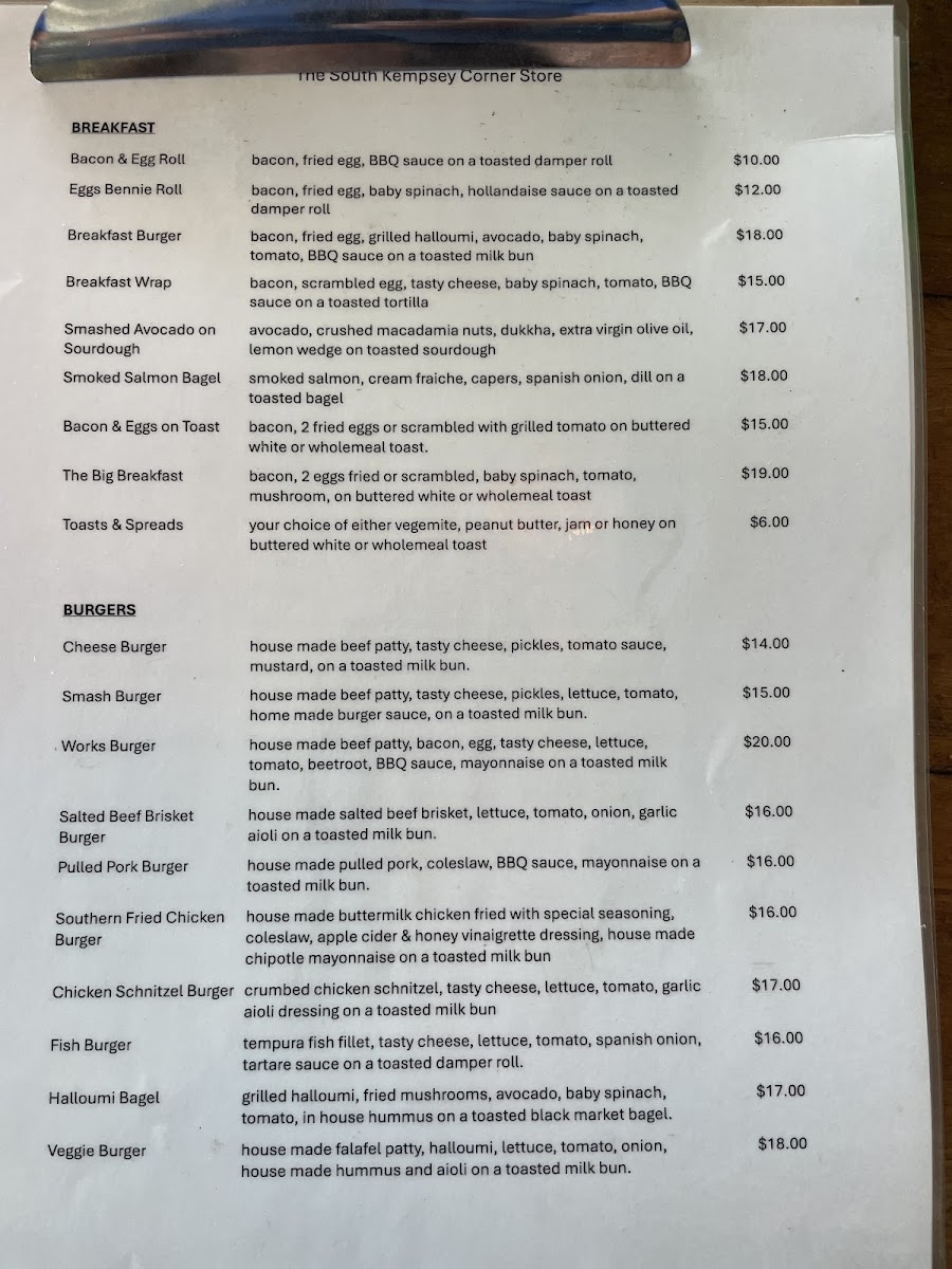 The menu at South Kempsey Corner Store at 46 Lachlan St, South Kempsey, offers a well-rounded selection that caters to both breakfast and lunch cravings. For breakfast, diners can enjoy classics like the Bacon & Egg Roll, the indulgent Eggs Bennie Roll, a hearty Breakfast Burger, a convenient Breakfast Wrap, or a lighter option with Smashed Avocado on Sourdough. Moving into the burger section, the variety continues with the Cheese Burger, the satisfying Smash Burger, the loaded Works Burger, the rich Salted Beef Brisket Burger, and the savory Pulled Pork Burger. Those seeking sandwiches, wraps, or salads have tempting choices including the crispy Chicken Schnitzel Sandwich, the flavorful Toasted Reuben Sandwich, the herby Toasted Chicken Pesto Sandwich, the classic Toasted Steak Sandwich, and the simple yet satisfying BLT. Overall, the menu demonstrates a balance between comfort food favorites and gourmet twists, making it a versatile spot for a casual meal.